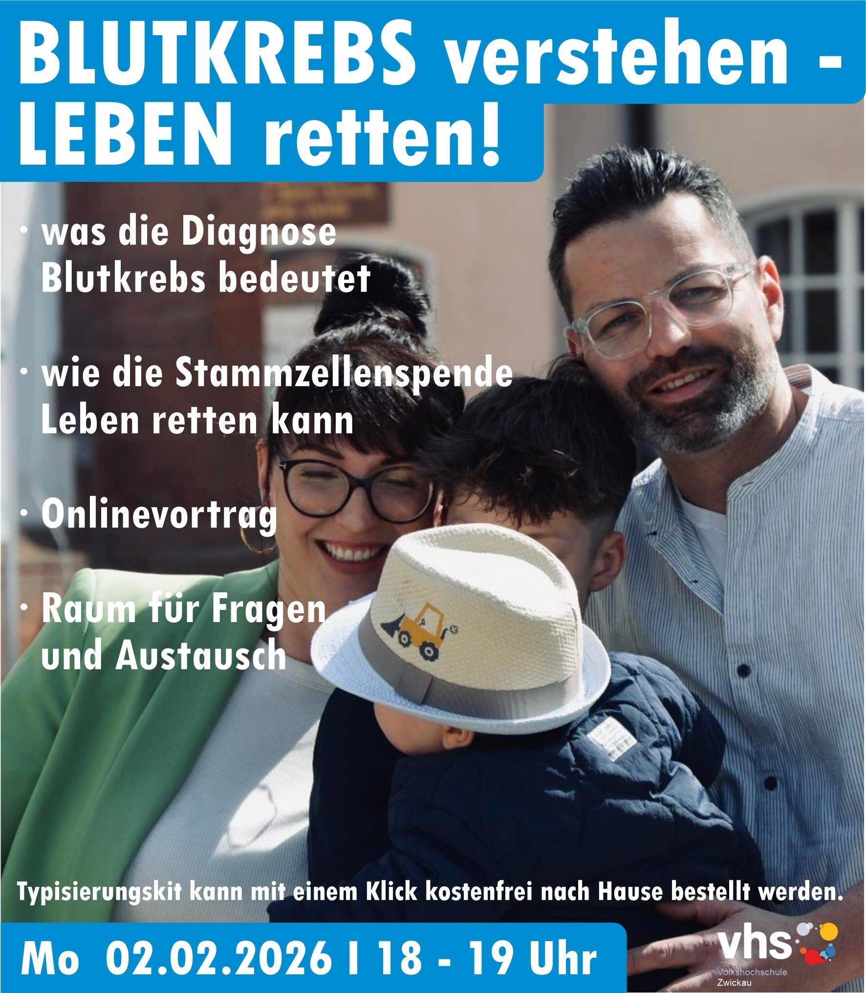 Dieses bewegende, regionale Beispiel macht deutlich, wie existenziell Blutkrebs ist – und wie dringend Betroffene auf eine passende Stammzellenspende angewiesen sind. Der Onlinevortrag erklärt verständlich, was hinter der Erkrankung steckt, wie eine Typisierung abläuft und warum jede Registrierung Hoffnung schenken kann. Im Anschluss gibt es Raum für Fragen und persönlichen Austausch. Außerdem kann online unkompliziert ein Typisierungskit bestellt werden.