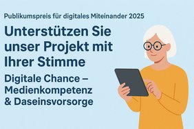 Unser Projekt „Digitale Chance – Medienkompetenz & Daseinsvorsorge“ wurde für den Publikumspreis für digitales Miteinander 2025 nominiert. Darüber freuen wir uns sehr – und nun zählt Ihre Unterstützung.